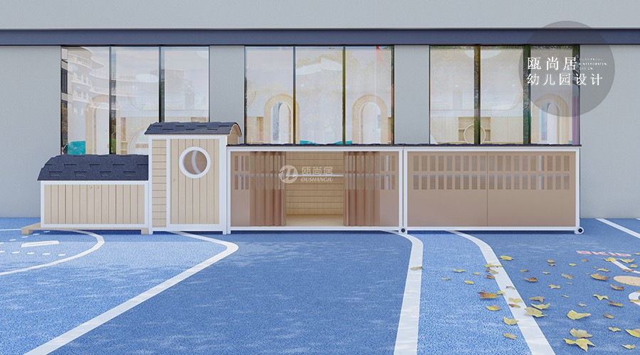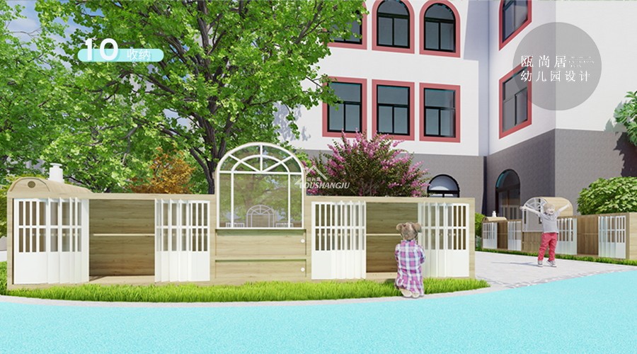 設置集中收納時,有造型的收納儲物間,讓收納儲物間的外觀造型與環境融合,滿足幼兒審美情趣,可以提升幼兒園戶外空間親和力。